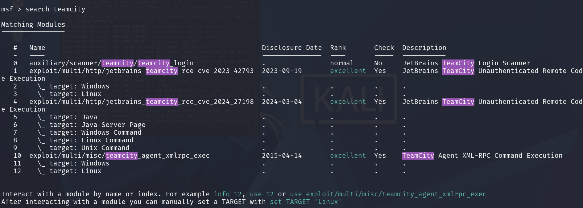 Öncelikle, msfconsole üzerinden kullanacağımız exploit’i tespit ediyorum.