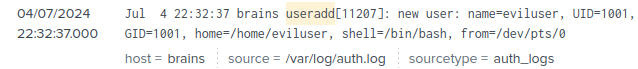 Bu noktada tam olarak aradığım log kaydına ulaşıyorum. 04/07/2024 tarihinde eviluser adlı bir kullanıcının oluşturulduğunu görüyorum.